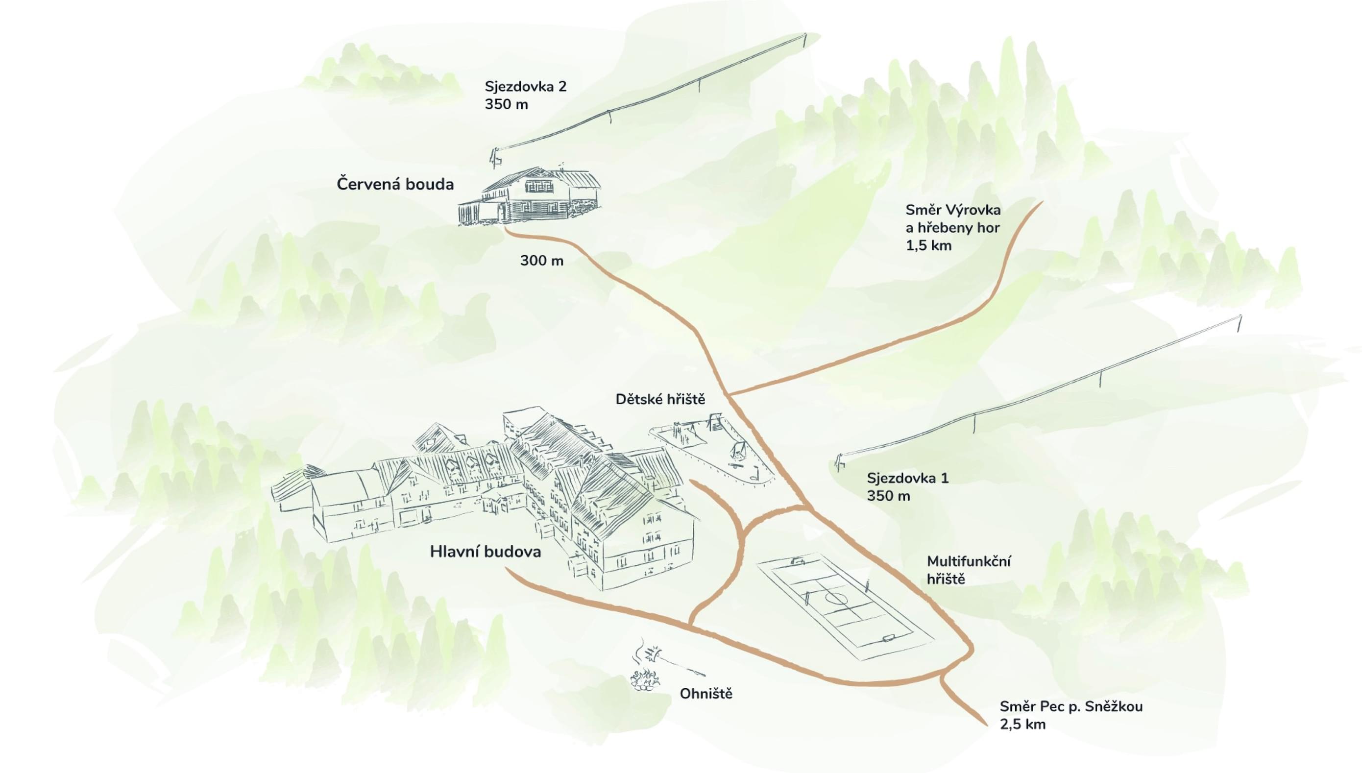 V hlavní budově se odehrává všechno zásadní dění. Najdete tu ubytování pro 77 lidí, recepci, pokoj pro hendikepované hosty, posilovnu, saunu, školící místnosti atd. Celá bouda je nekuřácká. Včetně restaurace, kde se servírují snídaně, obědy i večeře. Čeká tu na vás i půjčovna drobných sportovních potřeb. Takže si můžete v létě zahrát fotbal a v zimě si zasáňkovat. Po celé chatě najdete wifi připojení s vysokorychlostním internetem.